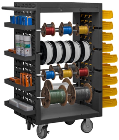 The Industrial Depot carries a full line of Durham Manufacturing products ranging from mobile carts to lockable safety cabinets. Durham's mobile wire cart is built to carry up to thirty-two spools of wire. The top of the cart has a workspace on the cart with a lip to prevent anything from falling off, while the bottom has lockable casters to help keep the cart from moving. On the sides of the cart, there are louvered panels that allows you to attach hook on metal trays or plastic bins.